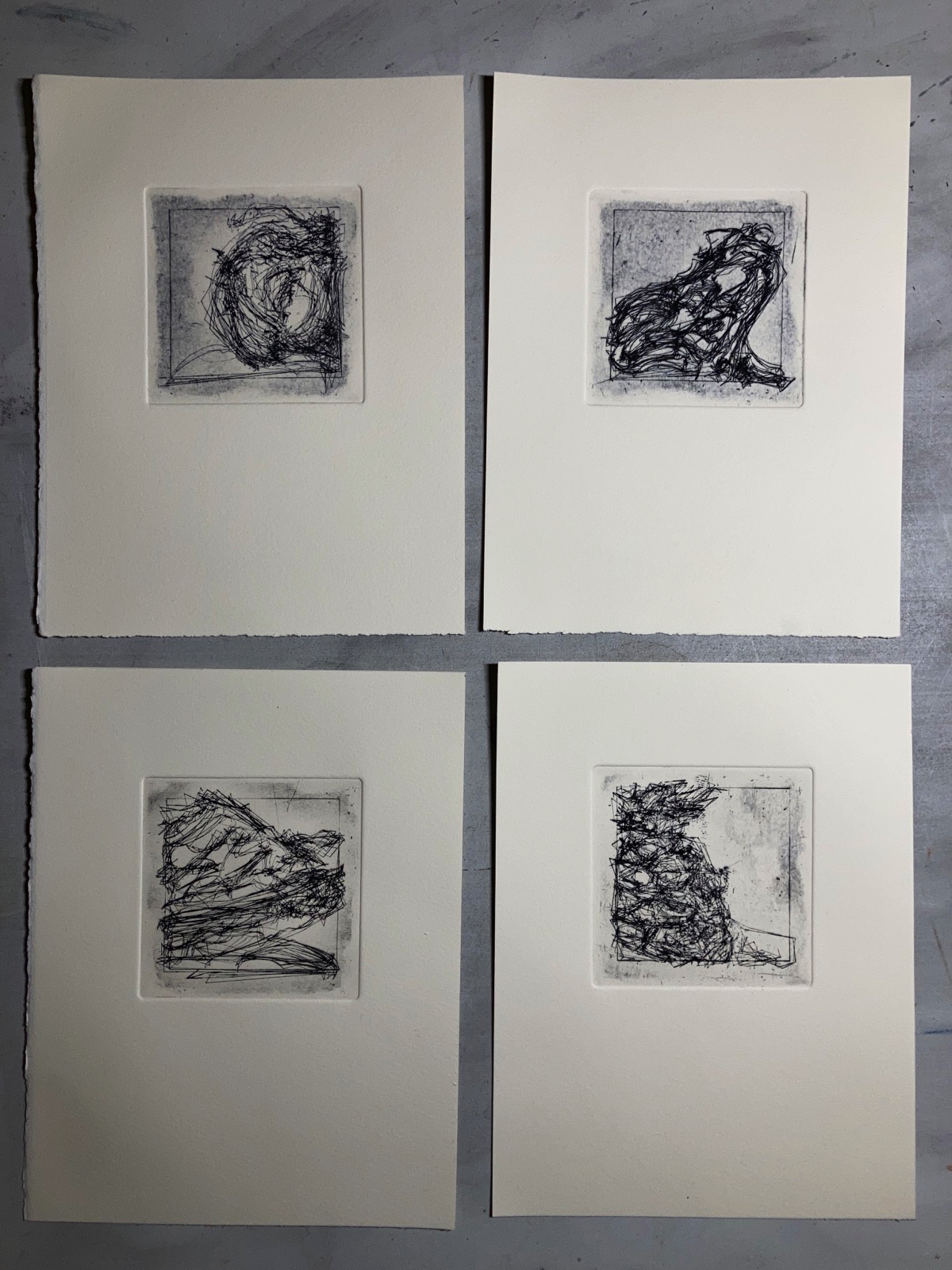 Image 12: “Quantum Fruit 2”, 4 dry point prints, Caligo Safewash on Somerset Satin paper, each image 100mm x 100mm on paper 250mm x 190mm