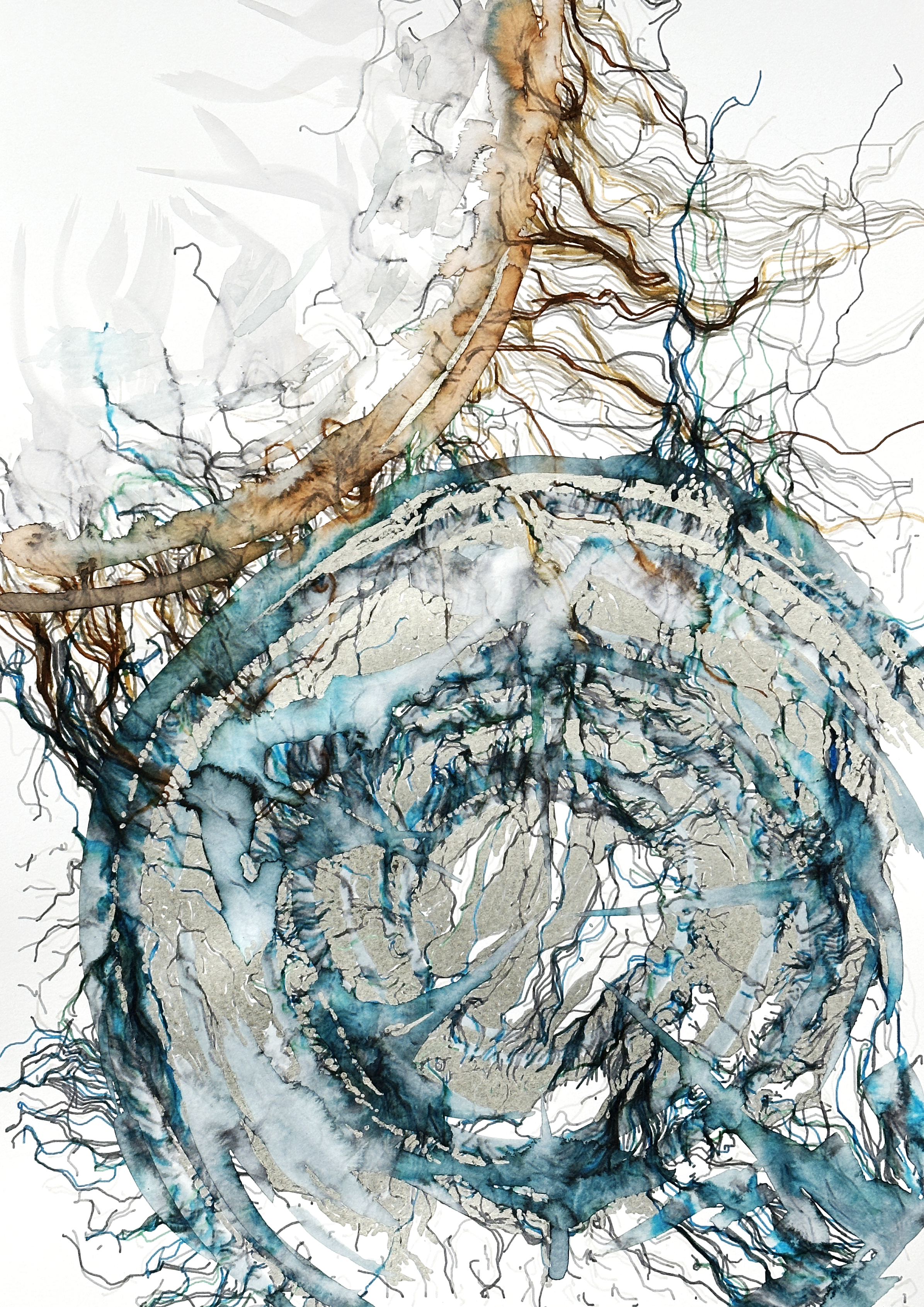 These works on paper are made using a process that runs between drawing by hand, building software, drawing by robot, and painting by hand. There are connections between my complicated art-making process and the subject matter; the indeterminate nature of reality at small scales, the inter-connectedness of everything, the emergence of particles from energy.