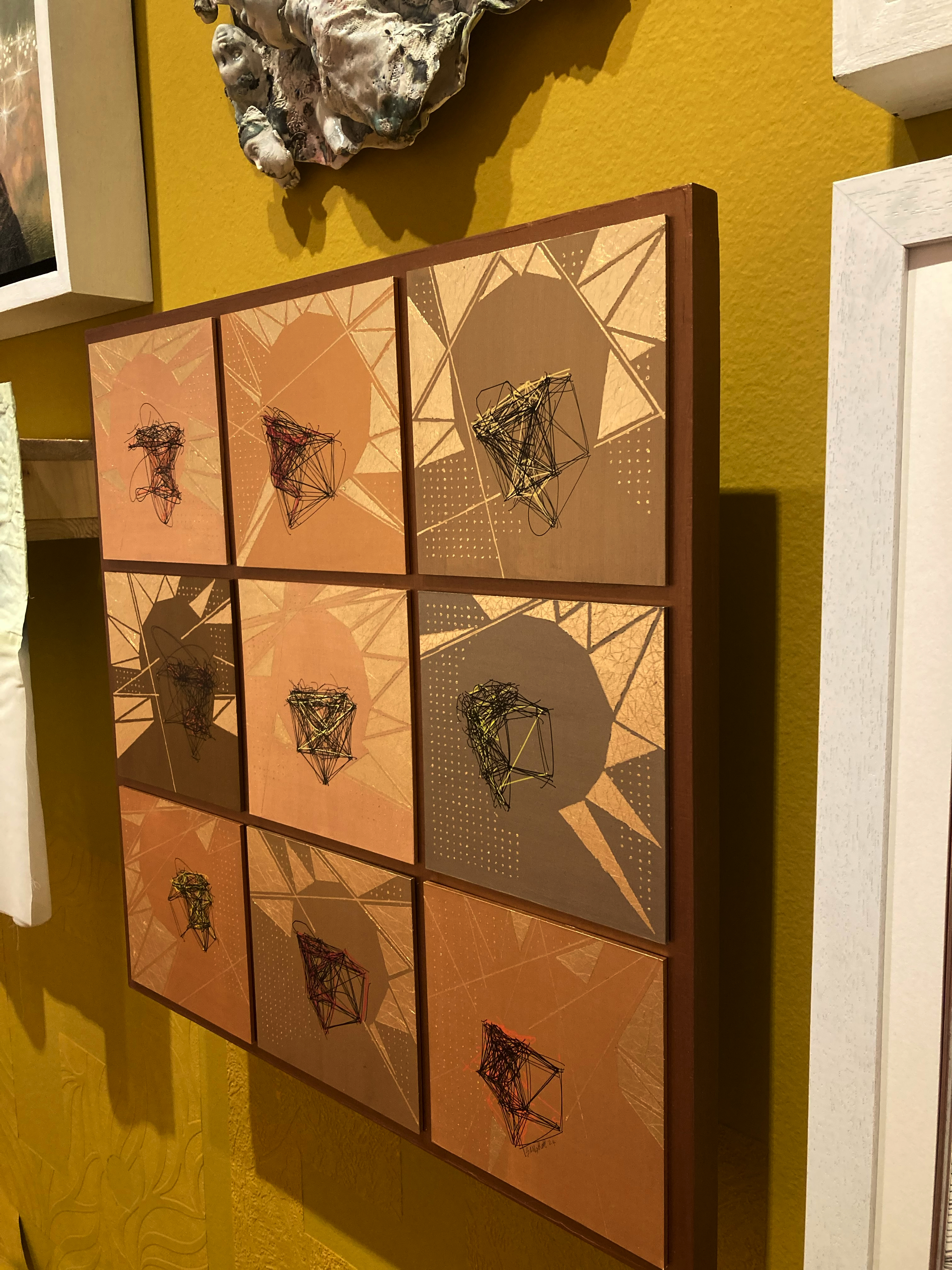 My piece is a response to tracking technology, Facial x9, in paint, ink, and gold leaf on wood, partly robot-drawn.