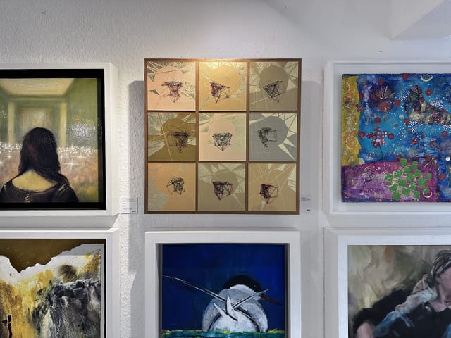 My piece, Facial x9, is a response to tracking technology. It’s made with paint, ink, and gold leaf on wood, and parts of it were robot-drawn.